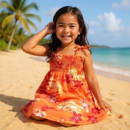 Spice up your little girl's wardrobe with this dancing Hawaiian dress. Easy, breezy and bright with an elasticized smock top & fun adjustable sunkiss ties.
