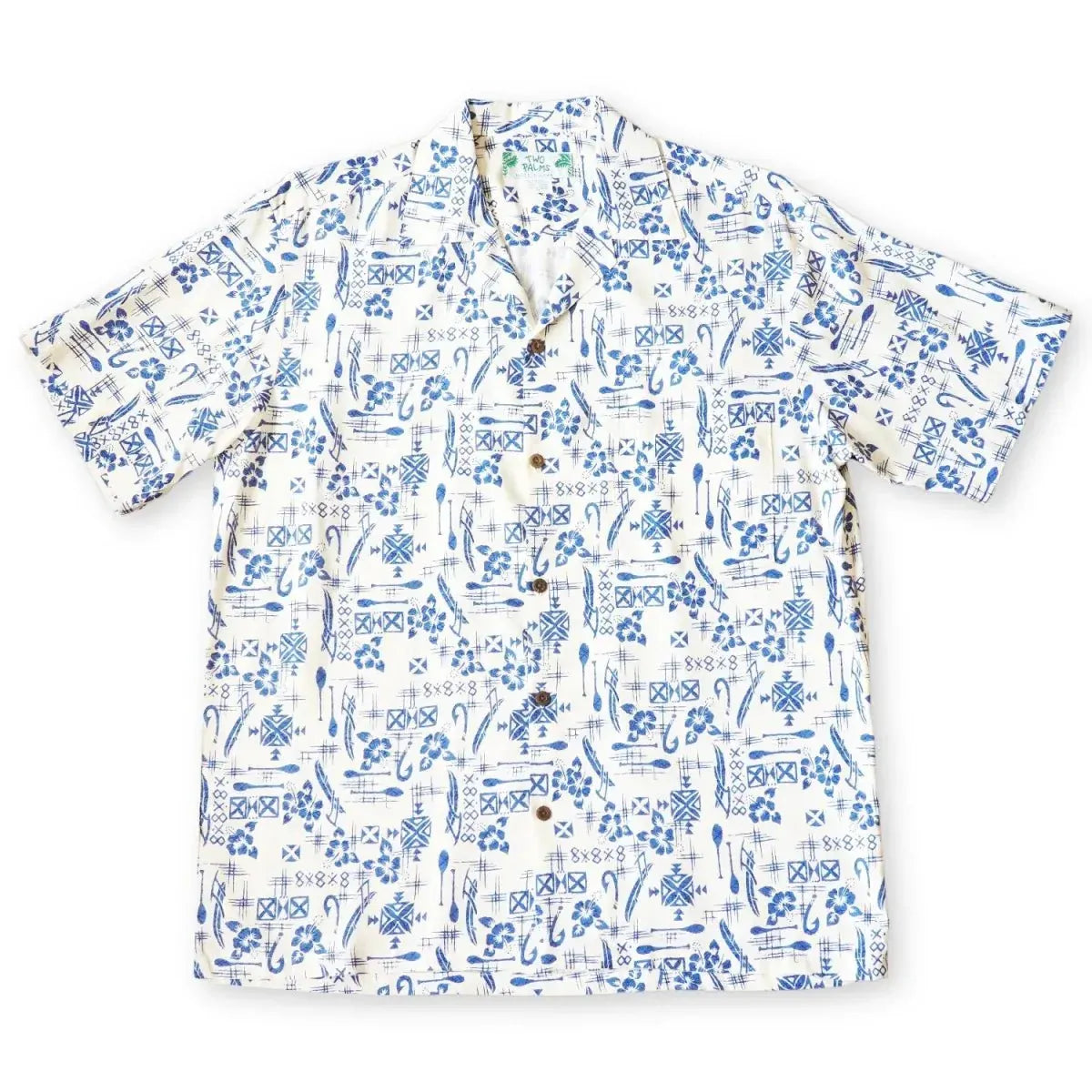 Introducing "Fish & Paddle," a vibrant Hawaiian aloha shirt that celebrates the island's rich maritime heritage. Featuring blue-colored graphics of outriggers and oars, fish hooks, hibiscus flowers, and traditional tapa squares, all set against a cream white background, this shirt embodies the adventurous spirit of the ocean. Whether you're casting lines in the crystal-clear waters or paddling out to catch the perfect wave, "Fish & Paddle" is your perfect companion for embracing the timeless allure of Hawaiian coastal living.
