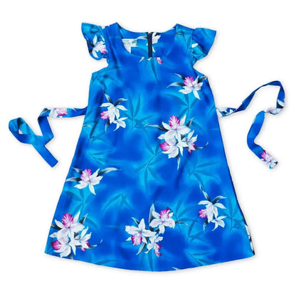 It whirls, it twirls, it hula in a fun floral print. This cute Hawaiian dress is sewn with ruffled sleeves, easy front/back tie in a pretty A-line shape. The perfect dress for the perfect Hawaiian island princess :)