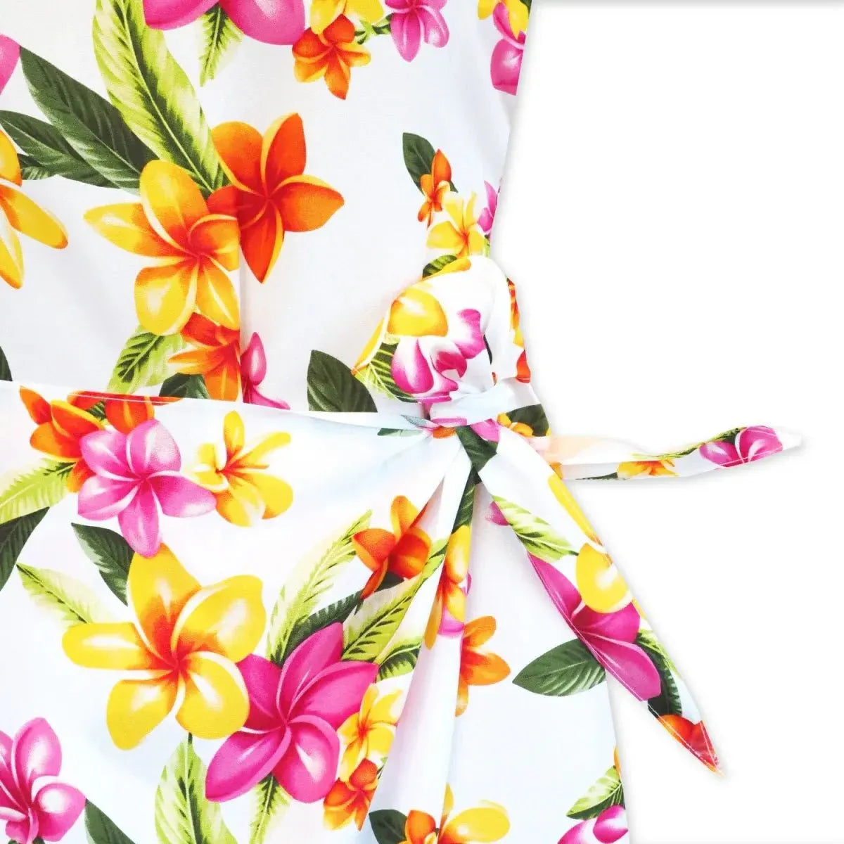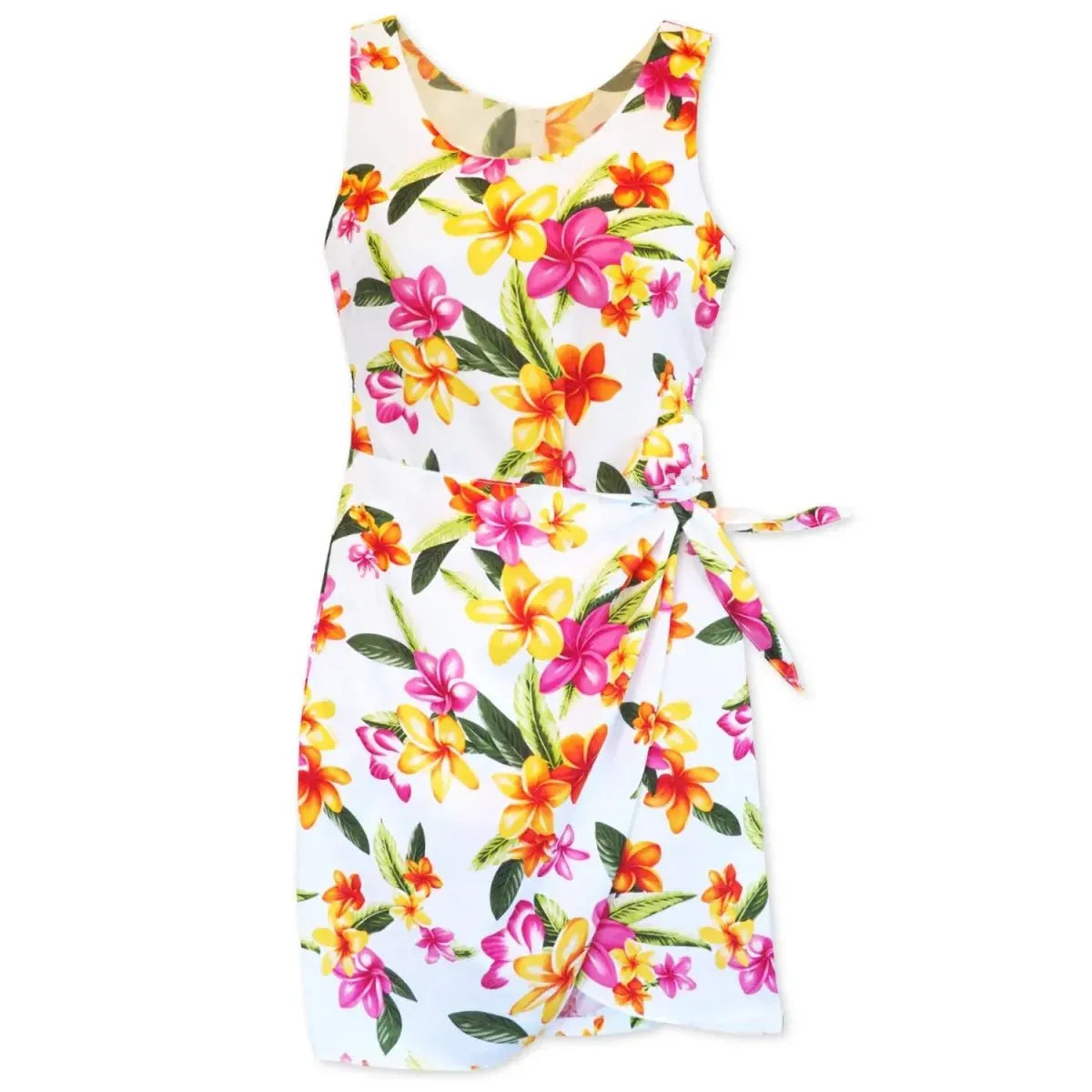 Blow kisses in this sexy Hawaiian dress. Round neckline falls to a flattering fit. Adjustable side sarong tie hugs your waist then blossoms to a tulip hemline. Easy back zipper makes this the perfect fun dress to wear. Let the floral flatter you as it honi and 'kiss' your body.