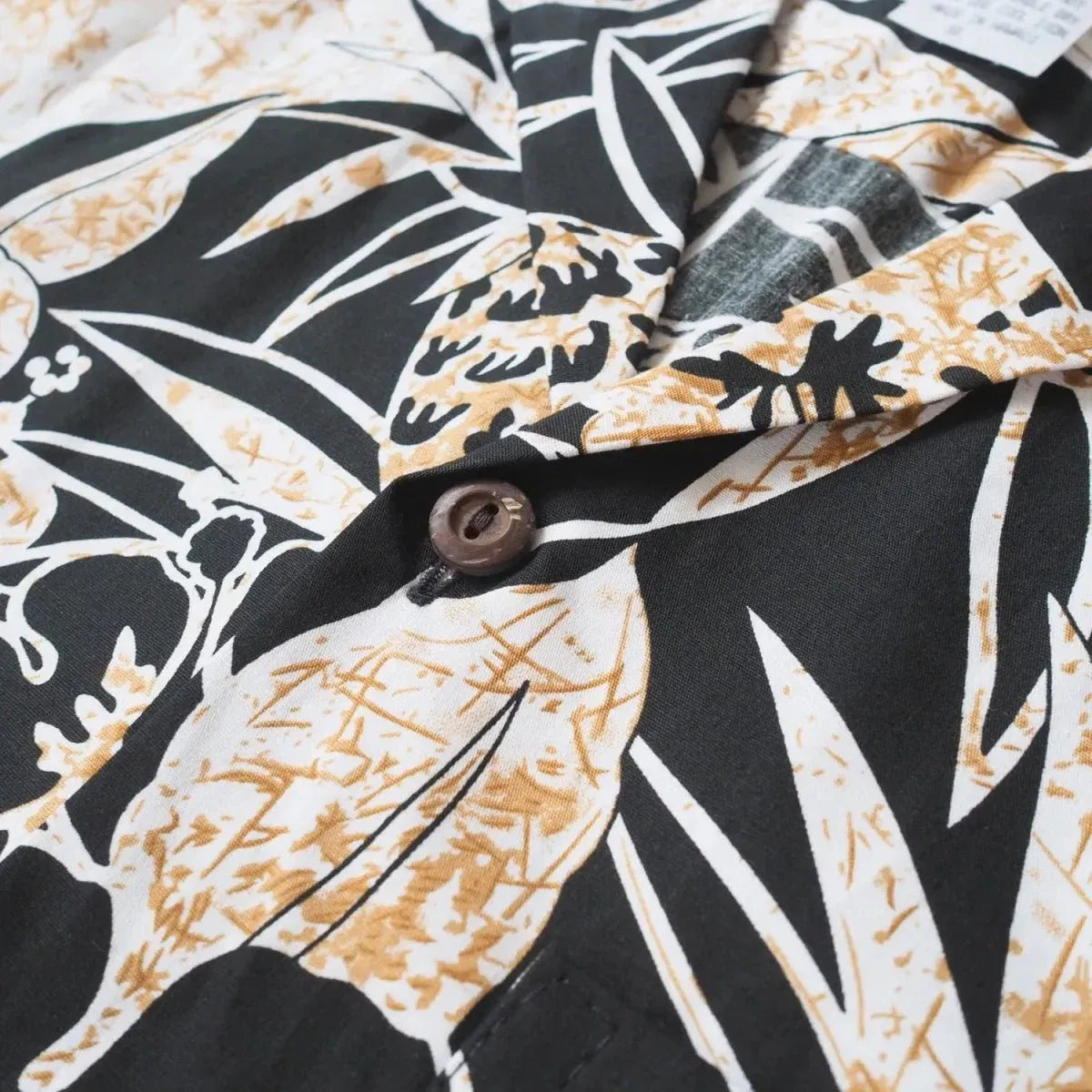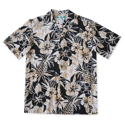 Introducing "Sweet Pineapple," a delightful ode to Hawaii's rich agricultural history. This Hawaiian aloha shirt features vibrant pineapples and hibiscus flowers set against a tan and black background. Symbolizing the legacy of pineapple farming in Hawaii, this shirt celebrates the island's fruitful past and tropical charm. Embrace the island spirit with this playful shirt, reminiscent of sunny days and sweet delights.
